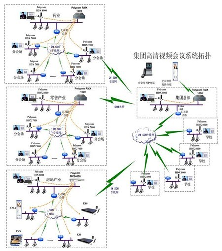 隨著我國改革開放的不斷深入,為加快信息交流速度,保證信息暢通,為滿足某集團視頻會議應(yīng)用的需求,某集團將基于SDH專線網(wǎng)絡(luò)及VPN ADSL專線,利用先進的通信傳輸技術(shù),組建統(tǒng)一的信息傳遞寬帶通道,連接從某集團總部到零售業(yè)集團分部、房地產(chǎn)集團分部、藥業(yè)集團分及學(xué)校部分的四大分部,各分部各自下轄相應(yīng)分支機構(gòu),其中零售分部為2M SDH專線網(wǎng)絡(luò),房地產(chǎn)分部為VPN ADSL專線網(wǎng)絡(luò),藥業(yè)集團暫時不會建設(shè)系統(tǒng),后期建設(shè)可以以零售業(yè)分部作為建設(shè)模板參考。學(xué)校部分的會場目前網(wǎng)絡(luò)是直接接入某集團總部,因此視頻會議系統(tǒng)中,學(xué)校部分會場全部直接接入總部,從而組成一套完整的視頻會議系統(tǒng),形成覆蓋整個企業(yè)集團。